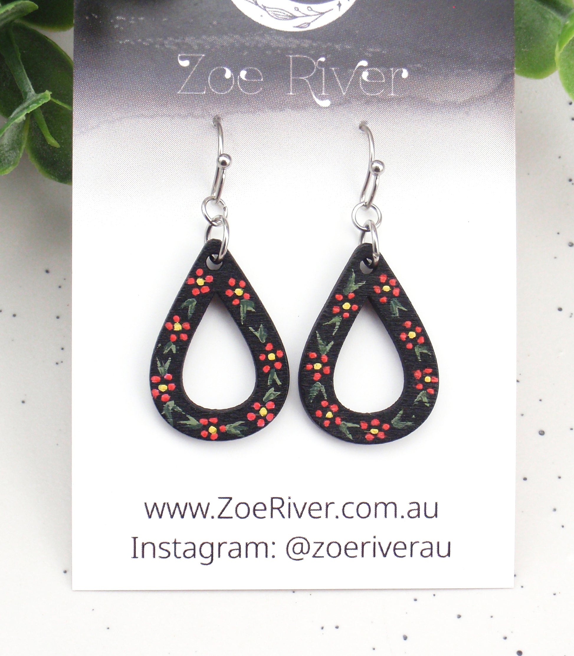 Dainty earrings handpainted black with sweet red flowers coloured flowers, with your choice of earwires - 925 sterling silver, stainless steel or nickel-free titanium. Choose from the drop-down boxes above.