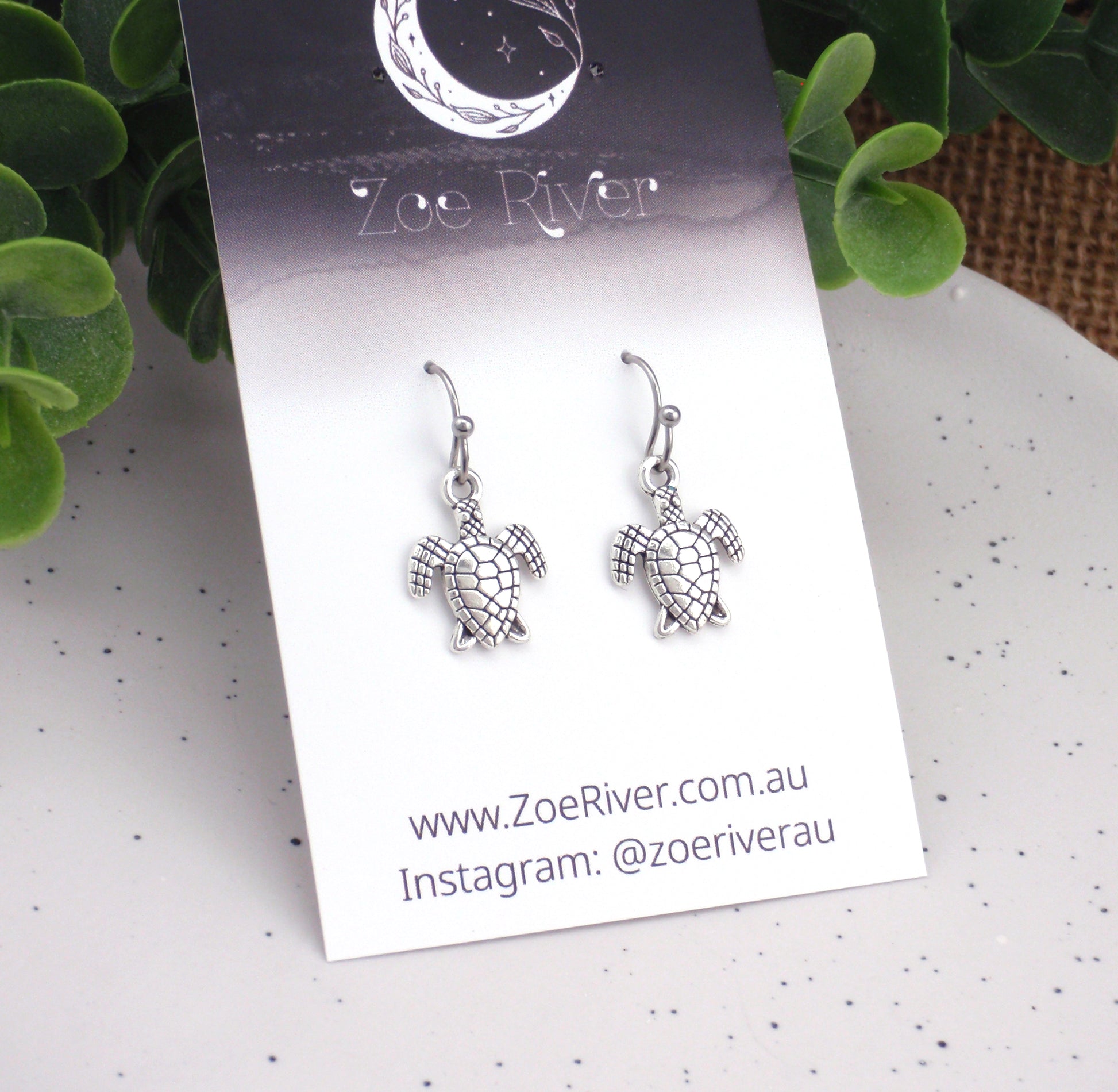 Dainty silver turtle earrings. Choose from Stainless steel, nickel free titanium or 925 sterling silver earwires. Small turtle earrings